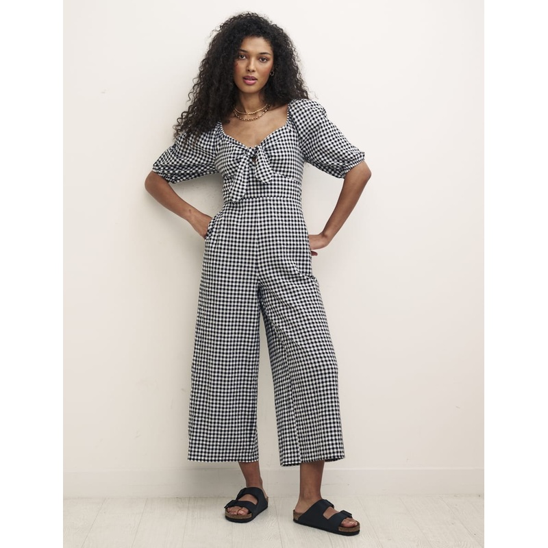 Simone is that one second outfit you need in your life. Shes a jumpsuit that you can simply throw on. We love the black and white gingham check on lightly textured seersucker fabric. Dont miss the sweetheart neckline, subtle cut-out front and pretty puff s