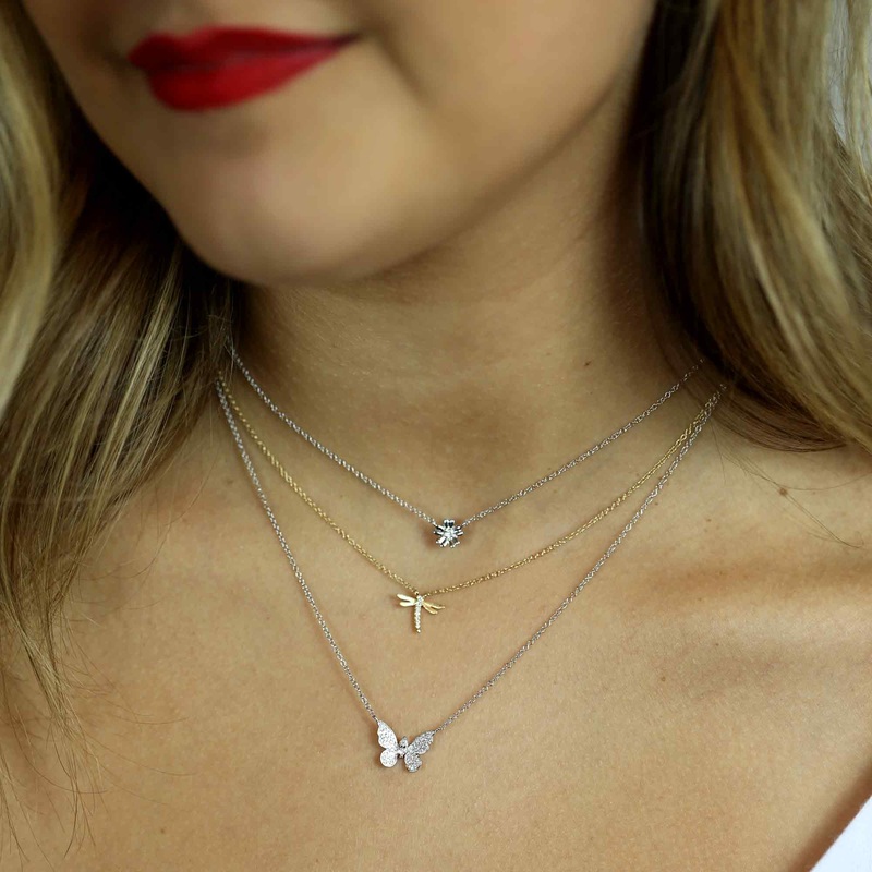 Thisdelicate and timeless Petite Blossom Diamond Necklace, set with a shimmering diamond center and a total weight of 1/25 carats is pure beauty. Craftedfrom 14 karat gold, this fixed pendant is accompanied by a 14-18″ adjustable chain and even has matching earrings to complete the look!