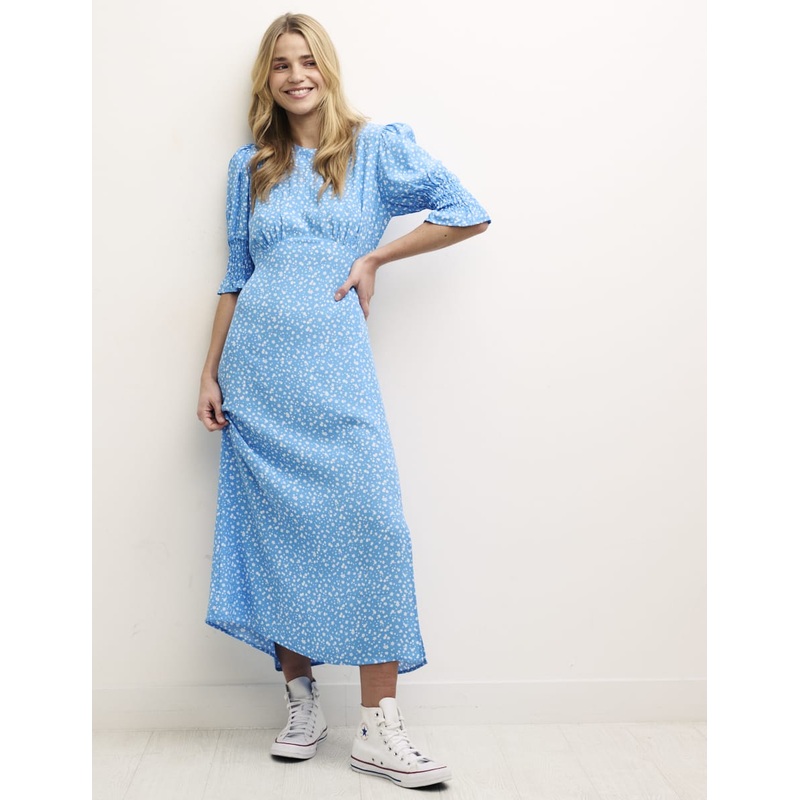 Expect compliments in our Luna midi. In a vintage-inspired shape with shirred cuffs, subtle frills and a leg-lengthening slit, shes low-key but elevated in an instant. Style her with high tops now and espadrilles later.