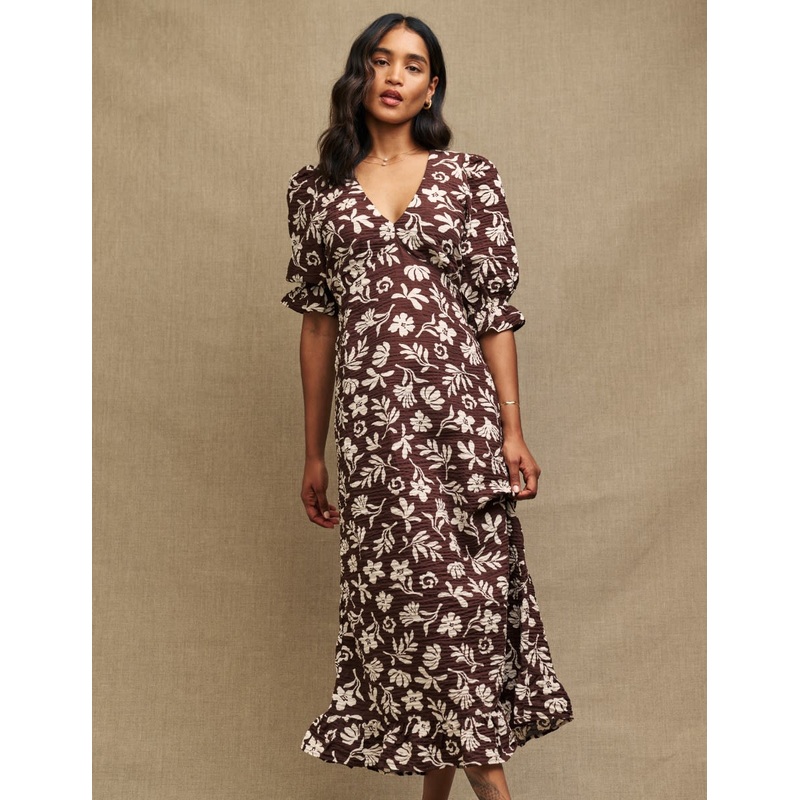 An NC icon edited for a petite fit. Delilah is a tea dress with a twist. Covered with natural botanicals, this chestnut brown midi has a low neckline plunges into a flattering v-shape, offset by pretty puff sleeves trimmed with pleated edges and a frill he