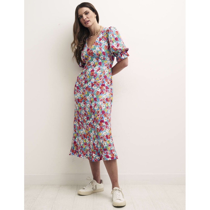 Delilah is a petite tea dress with a twist. A low neckline plunges into a flattering v-shape, offset by pretty puff sleeves trimmed with pleated edges and a frill hem. The cuffs have been stitched with a touch of stretch so you can adjust the volume. Wear with trainers for your next brunch.