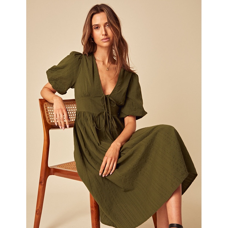 Summer in Scarla. Coming in a khaki shade, we love her so-now tie fastenings, pretty puff sleeves and relaxed skirt that skims the body. Style with boots or minimal heels to make her feel extra special.