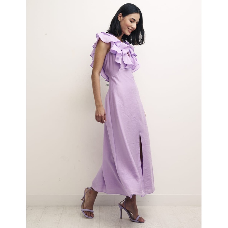 Lilac is the colour we cant get enough of right now. Trimmed with a cascade of romantic ruffles front and back, this floaty petite midaxi falls into a plunge neckline thats effortlessly flattering. Other eye-catching details come in the form of a subtle ce