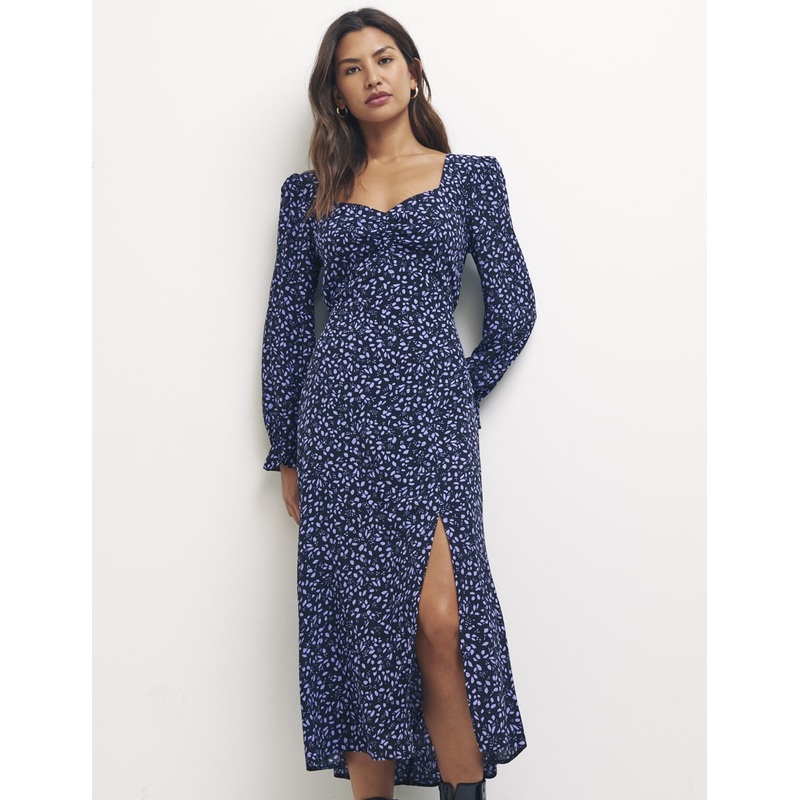 Weve got heart eyes for the petite Rosie dress. Now with long sleeves ideal for in-between months, this purple print midi is elevated by a vintage-inspired neckline, puff sleeves and a subtle leg slit. Finish the look with stompy boots.Sweetheart necklineL
