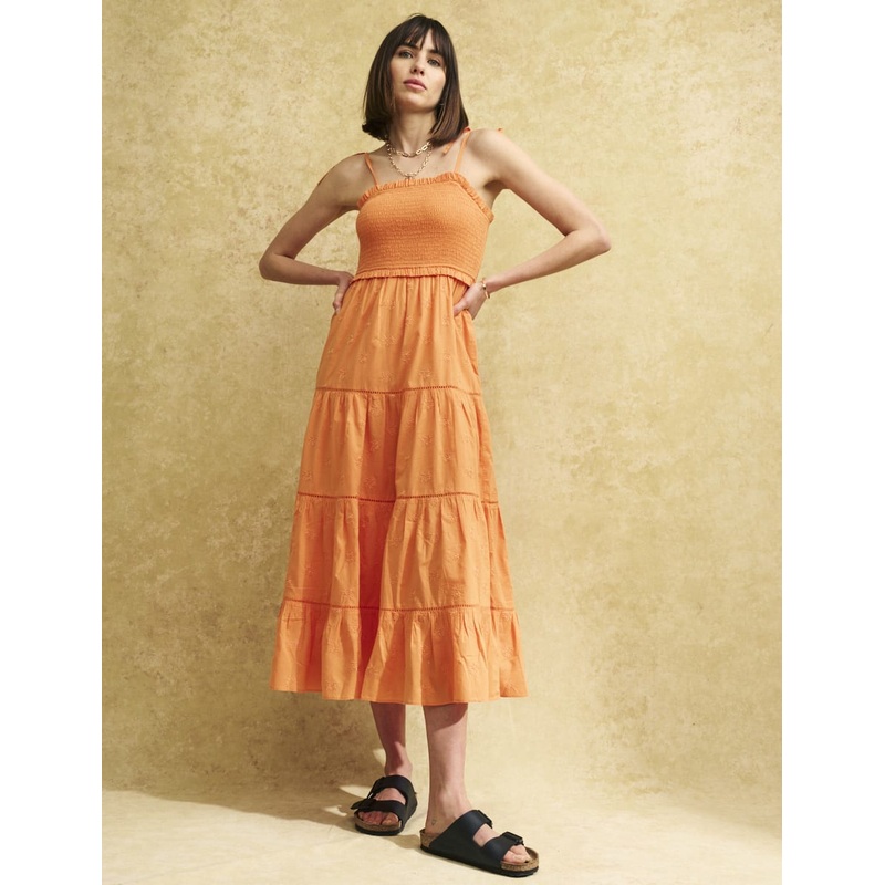 Billow around. Cut to a petite frame, this citrus orange midi dress is perfect for summer with tie-up straps. A shirred bodice tumbles into a series of ladder lace tiers, finished with floral embroidery. The end result is cool and considered. Style yours with chunky slides.