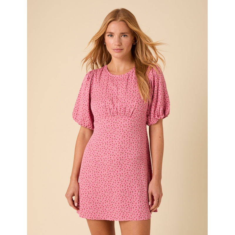 Dress her up or dial her down. This pink ditsy floral dress will take you from day to evening in an instant. We love her puff sleeves and swishy skirt. Style yours with black knee high boots and throw over a black cardigan. Round neck Mid-length puff sleev