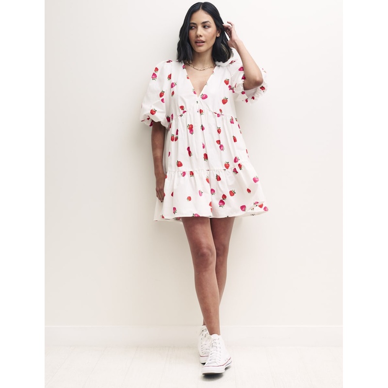 Making a statement in a strawberry print, our petite Vienna smock dress calls for days spent in the sun, whether its at home or on foreign shores. The fit is relaxed and roomy. She then plunges to a low v-neck before flipping into a tiered skirt with tie d