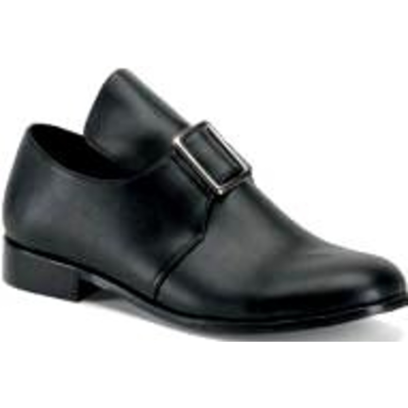 Faux Leather (PU) Colonial / Pilgrim Loafer Shoe w/Large Buckle, Fabric Lining & Padded Foot Insert. Rubber soles & 1.25" heel.Color: Black (shown)Size: M (10-11), L (12-13), XL (14)