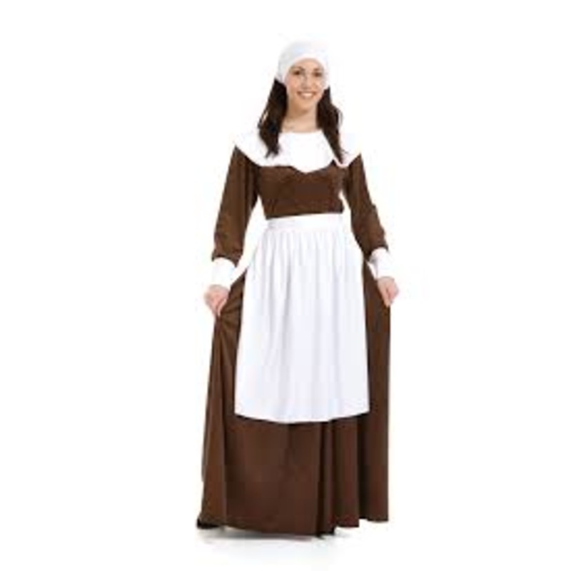 Includes: Brown Dress w/attached white collar, oversized cuffs & back zipper closure, White Apron & White Head Scarf.