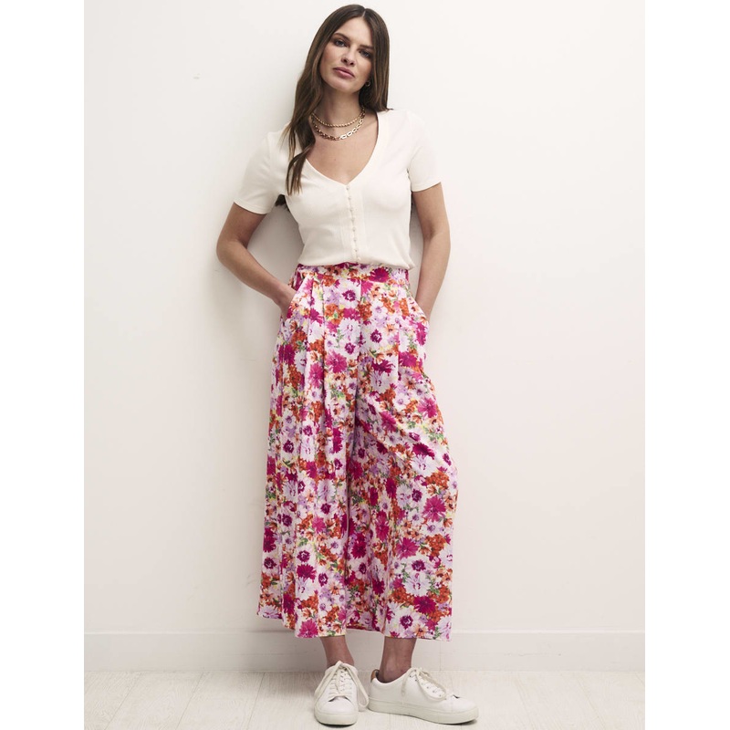 Go wide in our cropped Zeena trousers. With pretty pastel chrysanthemums print, they feel effortlessly summery and endlessly comfortable too. You have the relaxed fit to thank for that. Just add trainers.Front pleatsPocketsCropped lengthWide leg cut that s