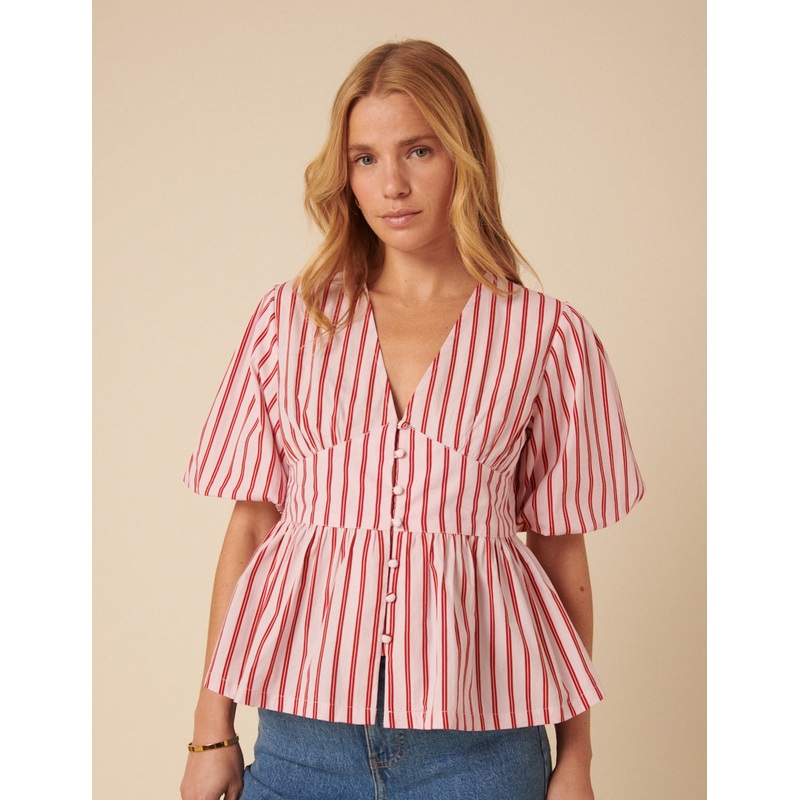 Weve taken everything you love about Starlight and made her into a top. Coming in soft pink and white stripe, we love the v-neckline, pretty line of covered buttons and statement puff sleeves. Style with everything you already own. Low v-neck Short puff sl