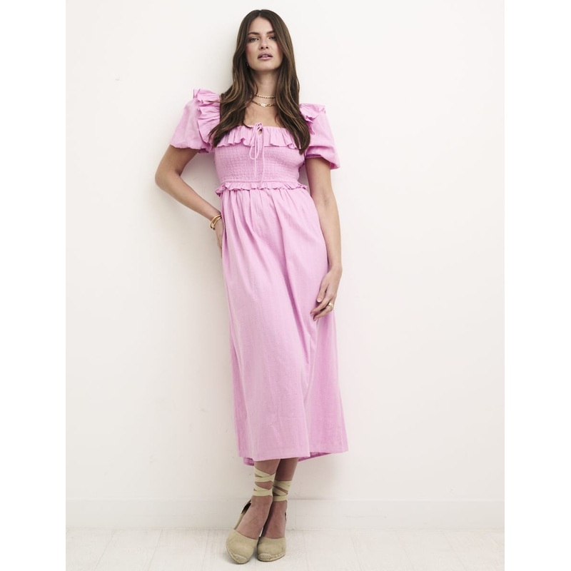With romantic ruffles and perfect puff sleeves, this brand-new midi radiates summertime. Infused with a little of our signature bohemian spirit, a tie up bodice is complemented by a square neckline and a smock-style shirred waist. Wear yours with espadrill