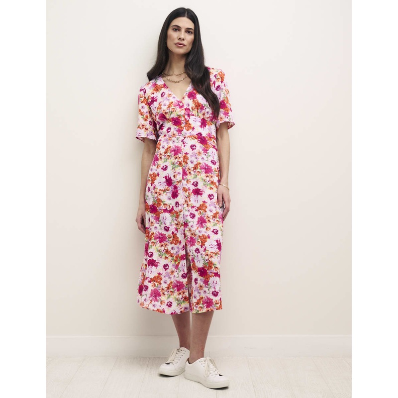 "One of our statement tea dresses, Alexa is blooming with chrysanthemum flowers. With short sleeves and a button-up front, this bold number sports a v-neck and a figure-skimming frame. Finish yours with chunky white trainers or nude sandals when the occasi