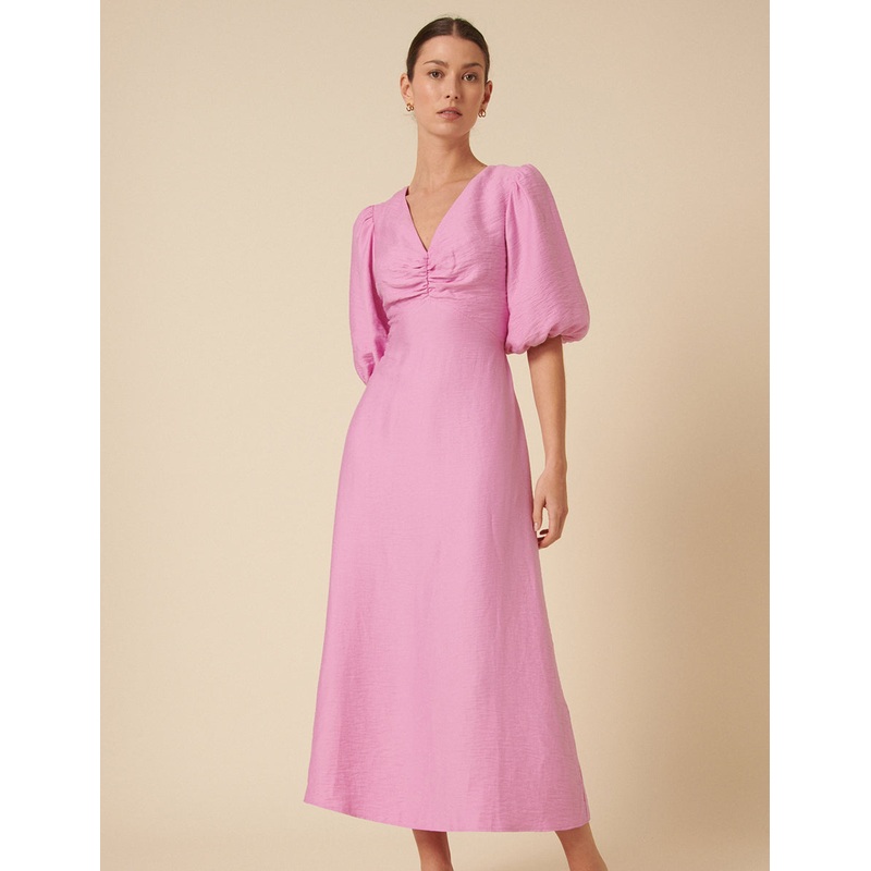 Designed to be seen in. With its vibrant pink hue and front gathering at the v-neckline, our dress falls to a swishy midi. We love the puff sleeves that add a touch of drama. Style with barely-there heels to make an impression. V-neck Front gathers Lightly