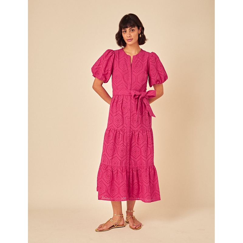 The midi you didnt know you needed. Coming in hot pink, were obsessed with the short puff sleeves, button down front and belt designed to flatter. Style yours with boots or barely-there heels. Round neck Short puff sleeves Belt Button down front