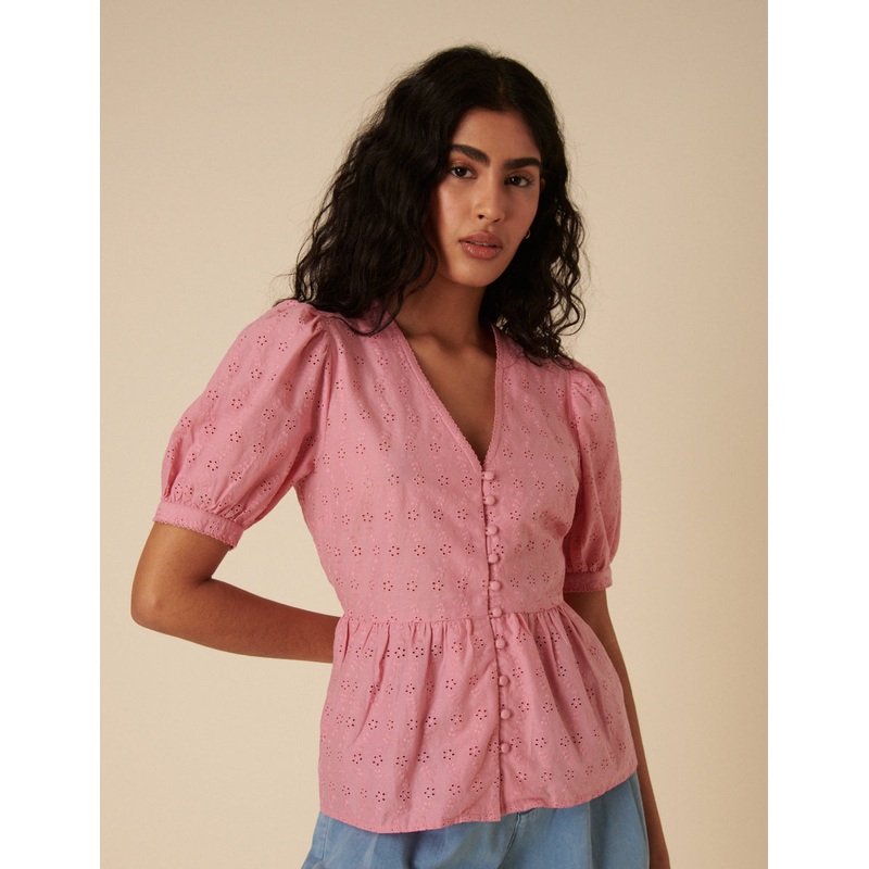 Ria is back, and this time shes a short sleeve. Romantic and feminine, our pink broderie blouse is all about texture. With its fitted waist, artful button front and short puff sleeves, shes the ultimate day-to-night top. Pair with jeans to complete the loo