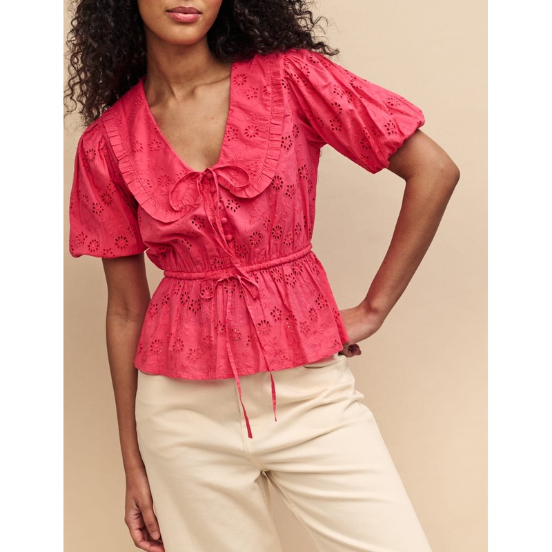 The ultimate waist definer. This hot pink top buttons up with a Peter Pan collar. Were wearing ours with wide leg denim and chunky slides.Drop collarShort puff sleevesButton frontCovered buttonsString tiesPeplum hem that defines the waist