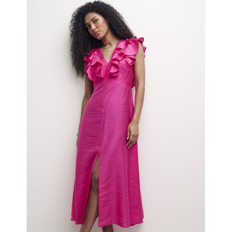 No colour is hotter right now than bright pink. Trimmed with a cascade of romantic ruffles front and back, this floaty midaxi falls into a plunge neckline thats effortlessly flattering. Other eye-catching details come in the form of a subtle centre slit that lengthens your legs and a low cut back with a tie fastening. In love? We are. Just add sandals and a glass of something fizzy. Wedding season is almost here.