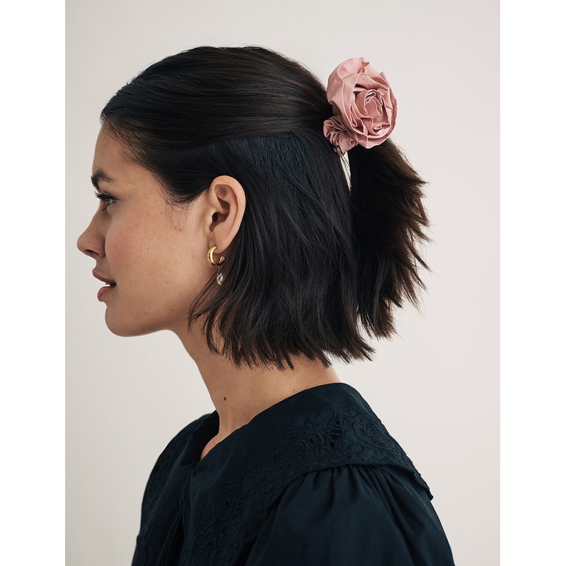 A so-now scrunchie with a floral twist. Your new favourite hair accessory comes in a pretty pink shade. Pop her in your hair to add an extra feminine flourish to any outfit.