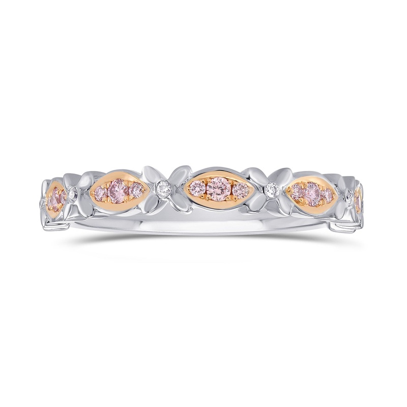 An exquisite diamond band ring, featuring pave-set marquise motifs, set with fancy pink round brilliant diamonds, accented with collection colorless round brilliants. Mounted in 18K white and rose gold.