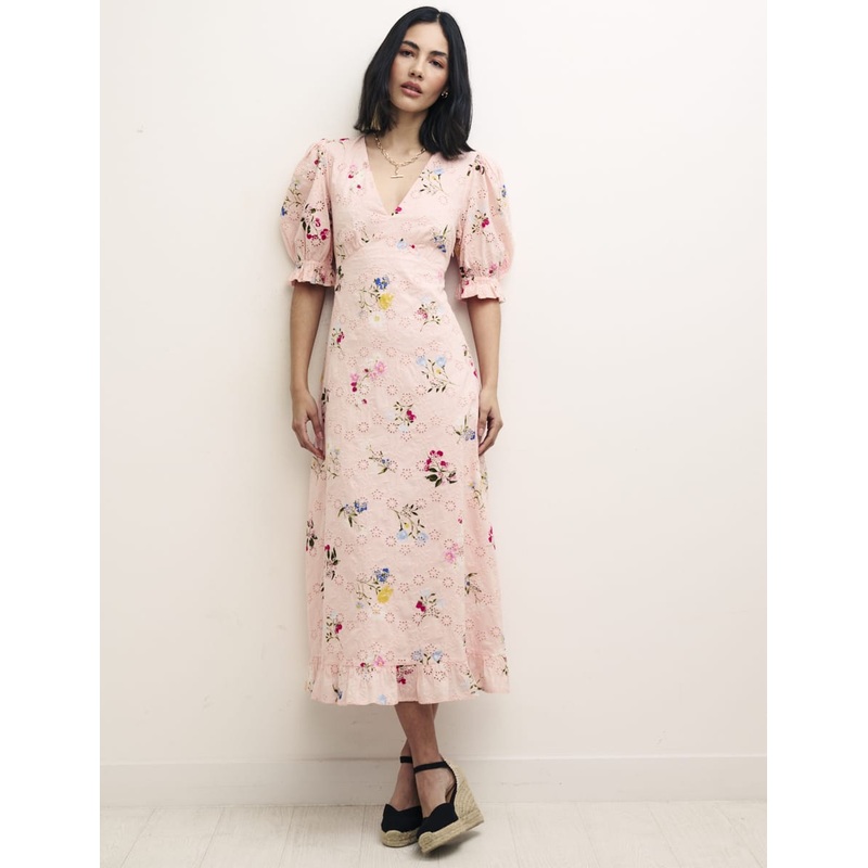 Demis new around here. Shes just the thing for breezing around cobbled markets with a straw bag. We love the flower and fruit patterned broderie anglaise, puff sleeves and frill hem. Just add espadrilles for day trips that end with a drink.