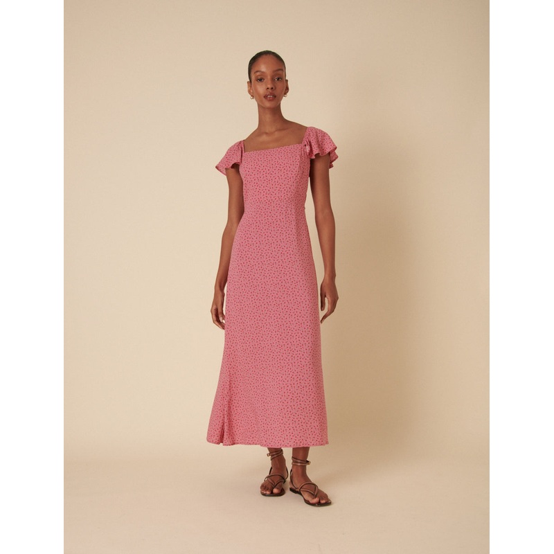 Going somewhere? With delicate flutter sleeves, Elsies a square neck midaxi dress thats sure to get you noticed. This pale pink floral design is ready for every event this summer. Shirring and tie back detail to the back just adds to the fit. Just add gold jewellery.