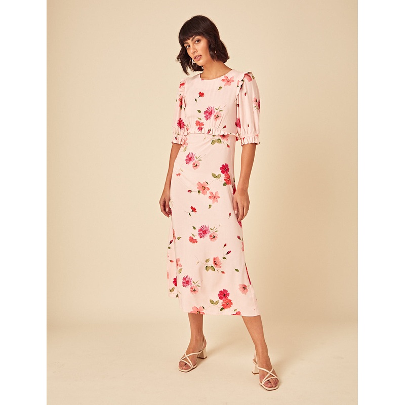 A love letter to florals. Featuring a delicate floral print, the Felicia midi dress is designed with soft puff sleeves, and frill trims at the sleeves and waist. Just add heels for your next event. Crew neck Short sleeves Concealed zip fastening Designed t