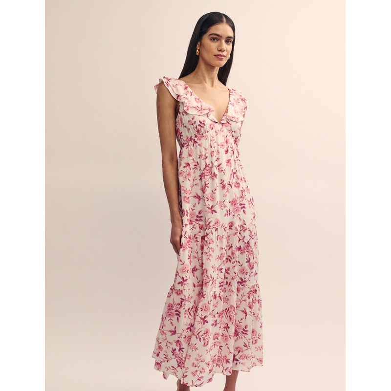 Your summer style is about to blossom. This pink floral midi dress feels instantly elevated. A v-shaped neckline, ruffle trims and a statement tier give this otherwise classic piece a so-now touch. Just add your most precious jewellery.V-neck Under bust se