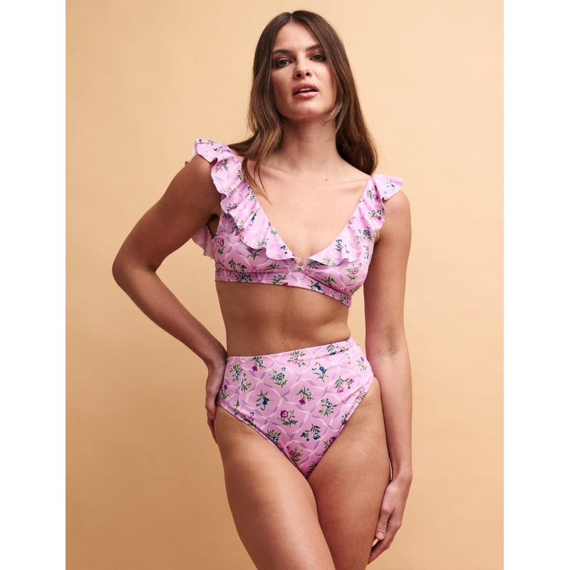 Our Gloria bikini bottoms are pink and floral printed. Taking style references from the 50s, the sculpting cut sits high on the waist. Layer a beach shirt loosely over the matching top to finish the look. High waisted cut