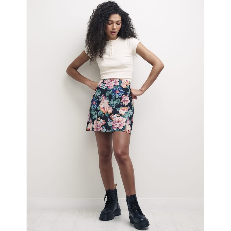 Introducing our new mini skirt Pearl in a midnight floral print. Style yours with a cute tee and stompy boots.Double side slitsA-line skirt that skims the bodyZip back fastening