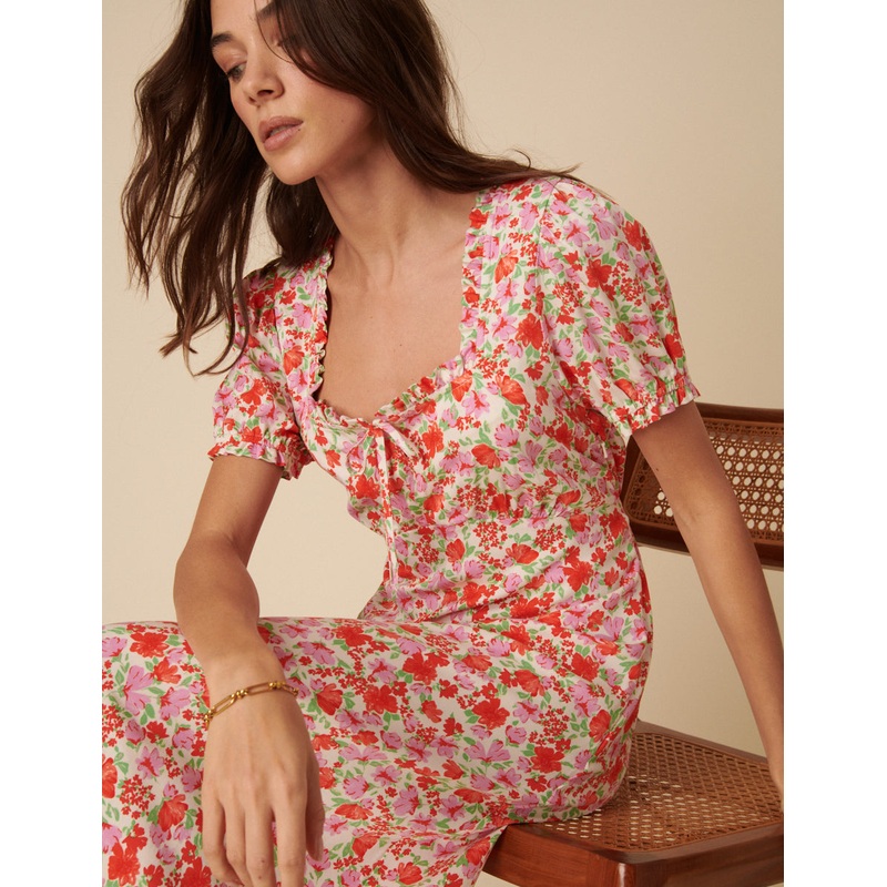 Forever floral. This classic midi dress comes in a red and pink floral print. A square neck is finished with ruffle trims and a prairie-inspired string tie that loops into a soft bow. Style yours with everything from trainers to barely-there sandals.