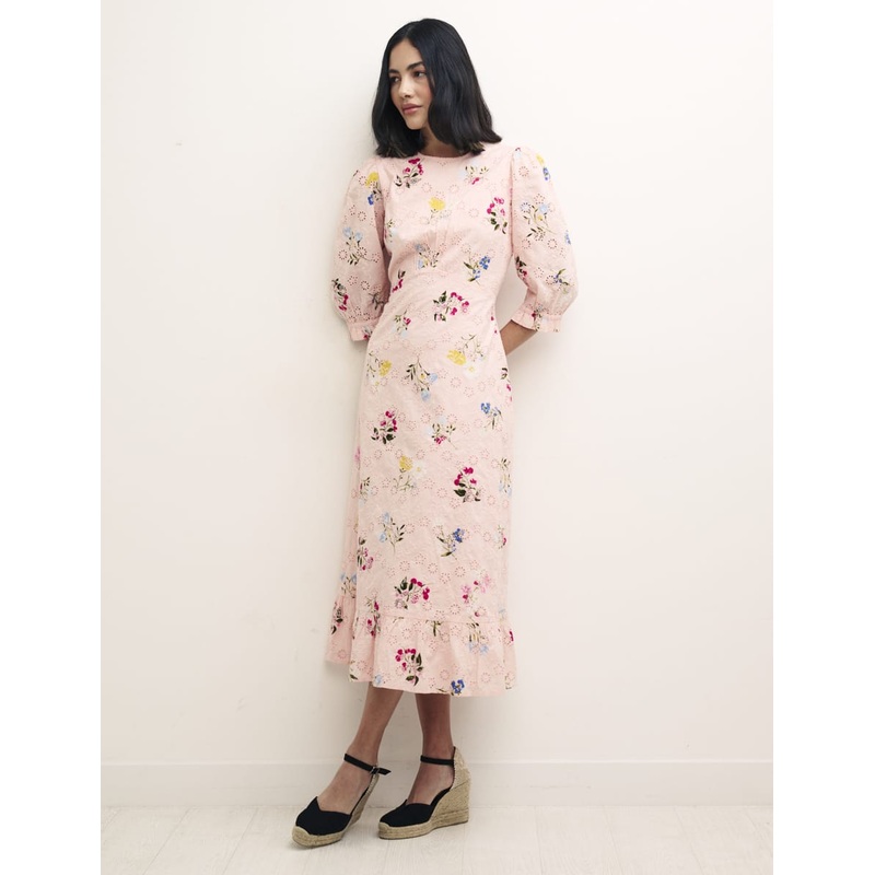 Another Selena day dress for your collection, re-edited in pink with scattered ditsy florals and fruit. Her mid-length sleeves have been finished with an elasticated ruffle cuff, cleverly designed so it can be adjusted to just your desired length. Style with trainers, chunky boots or heels.
