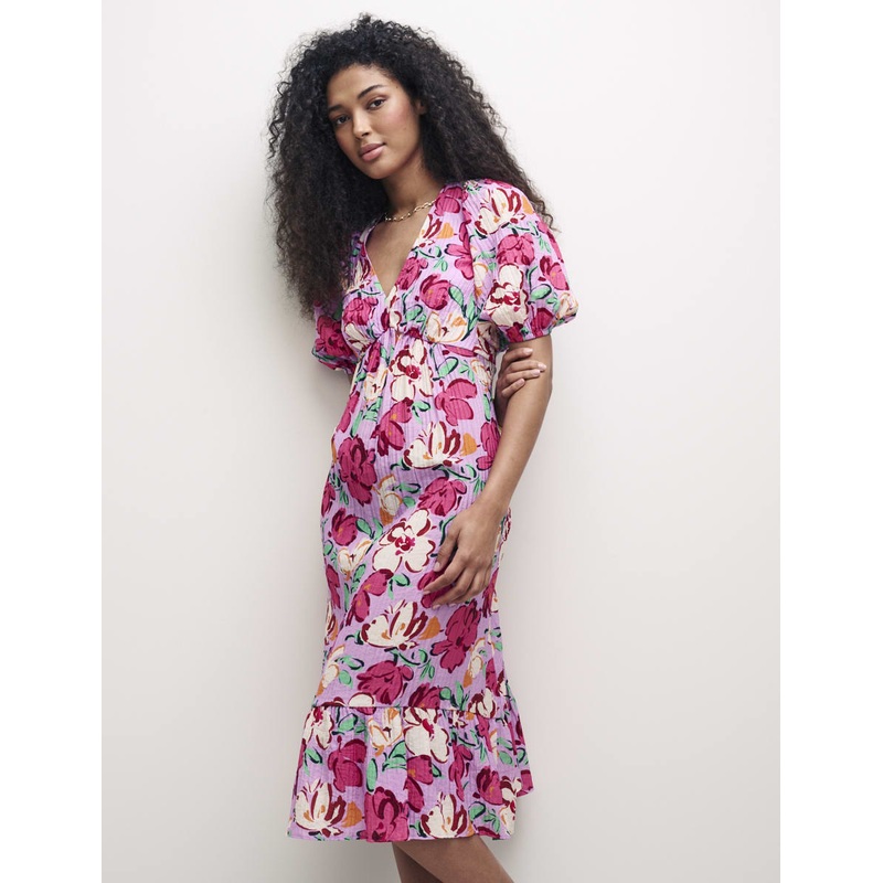Endless summer days call for smock dresses and we love Amy in this peony print. The lightly crinkled texture of this fabric adds to an already easy feel. The puff sleeves and tiered hem imbue the style with a little bohemian spirit. Slip her on with trainers.