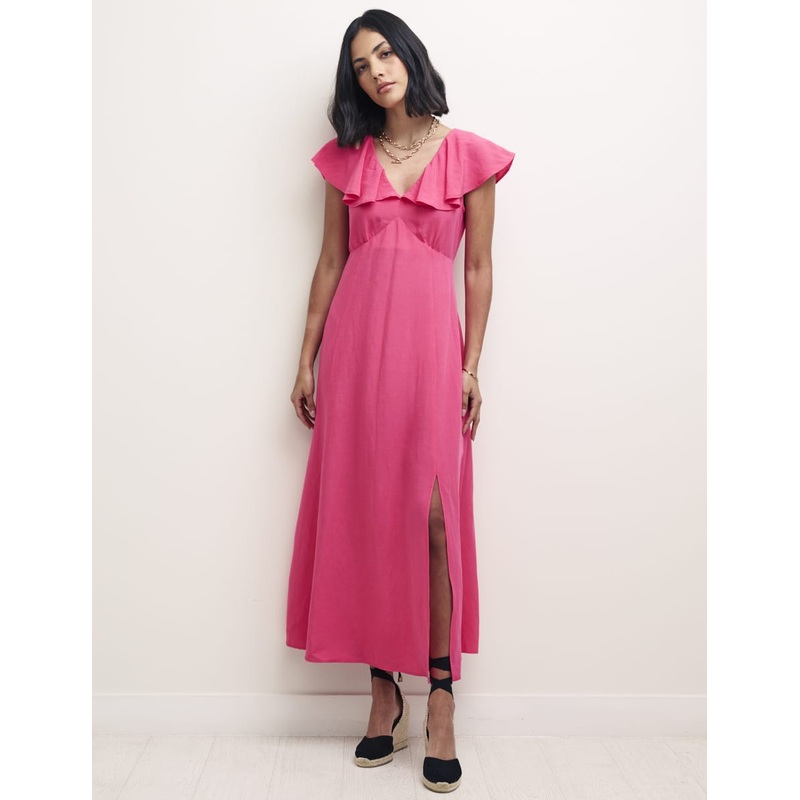 The hot pink trend prevails with our Suki midi design. The floaty shape gently skims your frame and features a flattering plunge v-neck. With a delicate low back, romantic frills and a subtle slit, shes sure to illicit compliments. Add some gold notes and a pair of espadrilles for sun-soaked celebrations.