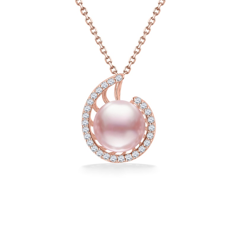 14K Rose Gold Nautilus Pendant with a 10mm Natural Pink Freshwater Pearl and 0.27 Carats (total weight) of Diamonds. 17″ 14K Rose Gold Chain included. The pendant measures approximately 13/16″ in length and approximately 9/16″ in width.
