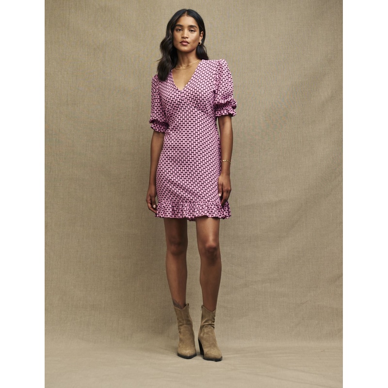 This Delilah dress might be mini but we havent skipped on a single detail. She features all the signatures a plunge neckline falls into a series of ruffle trims, finished with a bow detail at the back. Just add suede boots. V-neck Short puff sleeves Fitted