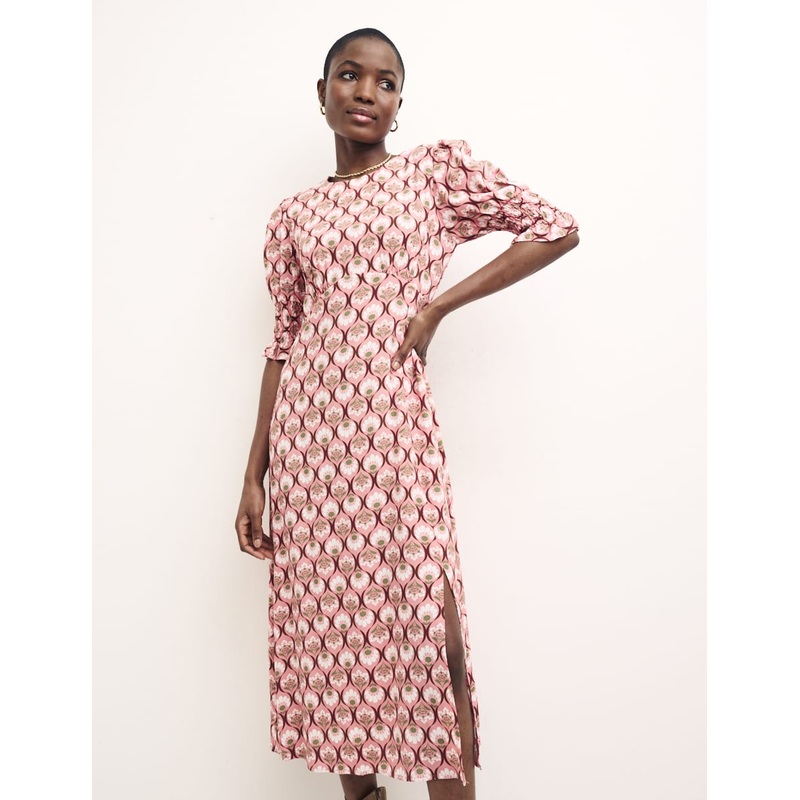 Expect compliments in our Luna midi dress. In a vintage-inspired shape with shirred cuffs, frills and a subtle leg slit, it's patterned in a pink retro print. Team with suede boots and gold accents.Round neckShirred short sleevesFront slitKeyhole back butt