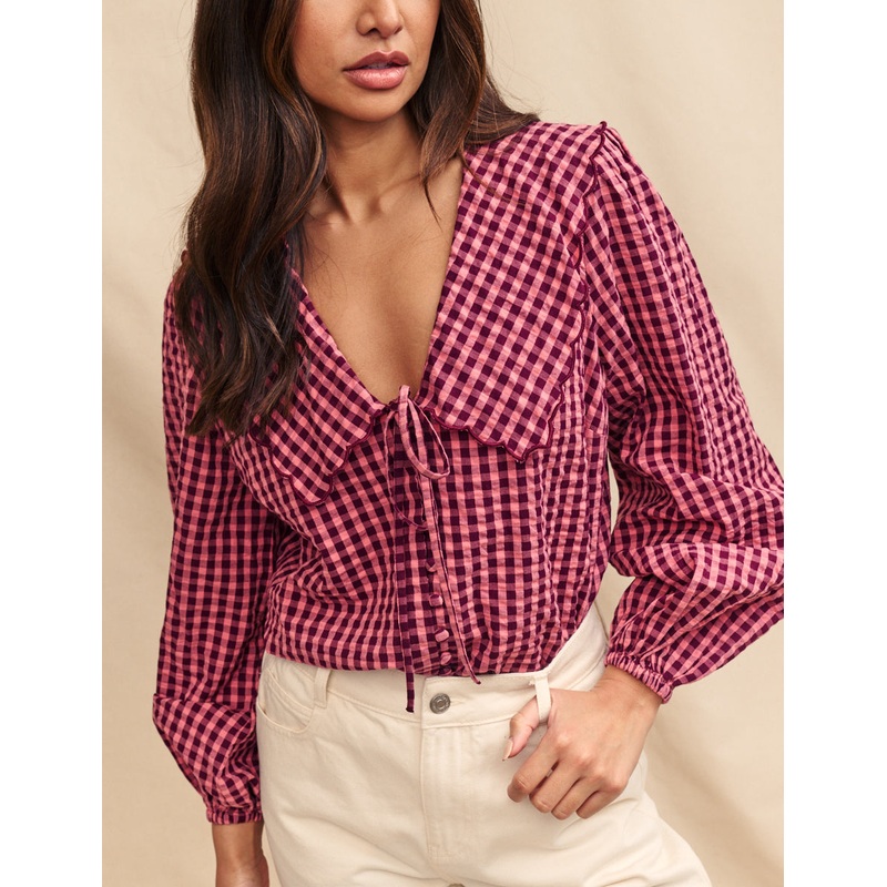 The Peter Pan collar is here to stay. This season the trend is back with a delicate scallop trim, string tie detailing and fabric covered buttons. Style yours with layers of gold jewellery.Drop collarLong balloon sleevesCovered buttons