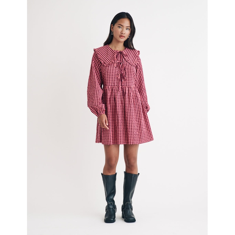 Pink and burgundy gingham for the win. This midi dress is the last word in easy dressing. The main features include a floppy ruffle collar and delicate string tie detailing trailed down the bodice. Pair yours with stompy boots to complete the look.