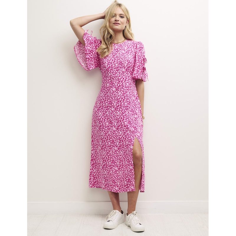 Bursting with illustrated hearts, this pink midi was made to be loved. Fluted sleeves come tied up with string ribbons whilst a subtle slit shows just the right amount of leg. Team yours with trainers. Round neck Fluted sleeves Side slit