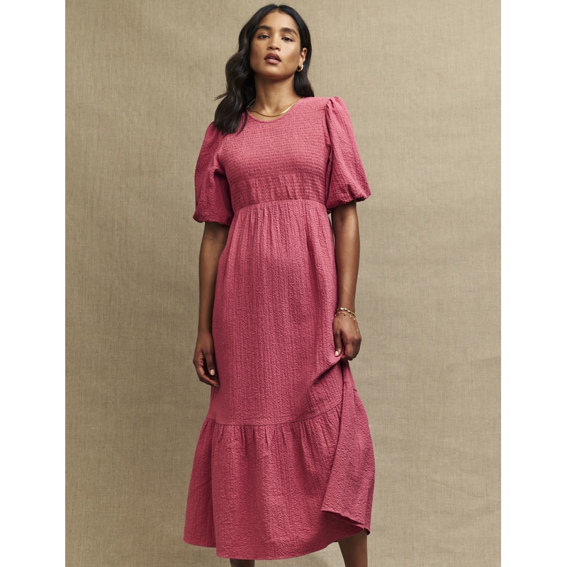 Looking for a new smock dress youll wear over and over? Kelsie is the one. Were also really into her extra puffy sleeves and floaty-tiered hem. Decorative shirring around the waist is as flattering as it is comfortable. Style yours with chunky slides. Roun