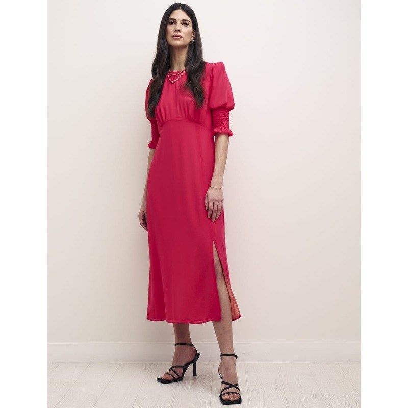 Expect compliments in our Luna midi. In a vintage-inspired shape with shirred cuffs, subtle frills and a leg-lengthening slit, shes low-key but elevated in an instant. So much more than just a tea dress, Luna does dinner reservations too. Style yours with a stroke of lipstick.