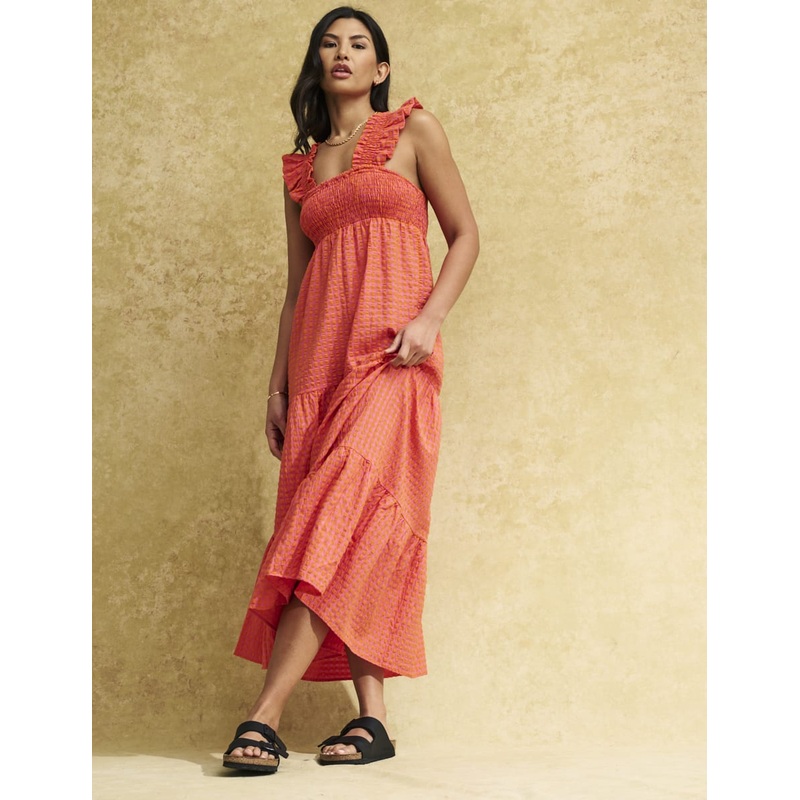 Everyone loves Maya. Shes a pink and orange gingham dress with a difference. A shirred smock-style cut tumbles into three tiers, topped off by thick ruffle straps. The fit is relaxed so were styling her with chunky slides for catch ups over coffee.