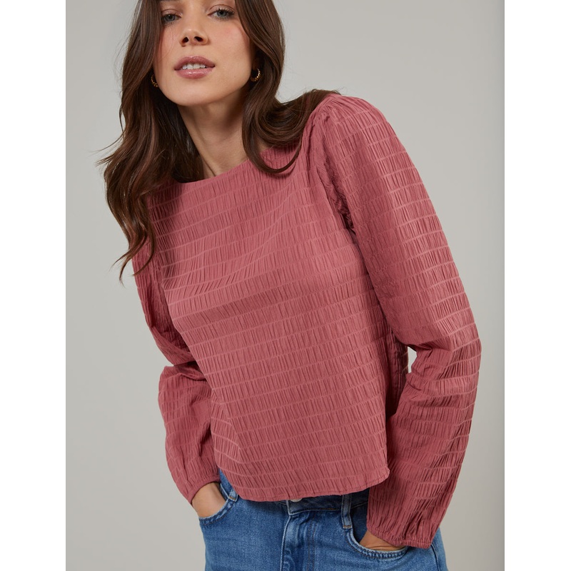 Meet your new go-to. Our textured pink top features a classic crew neck and long sleeves. Youre sure to wear it week after week. Were wearing ours with jeans and barely-there heels. Crew neck Long sleeves Designed for a relaxed fit