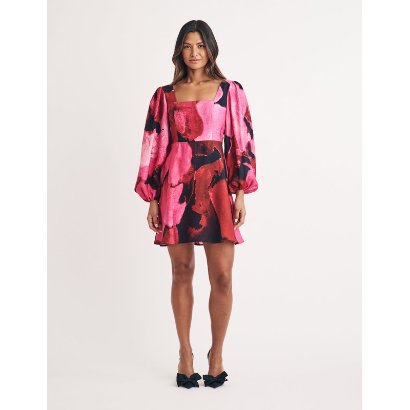 Add to guestlist. This pink floral piece will get you party-ready in an instant. She nips in softly at the waist with voluminous sheer balloon sleeves and a swishy mini skirt for balance. Just add your favourite gold jewellery and youre good to go.