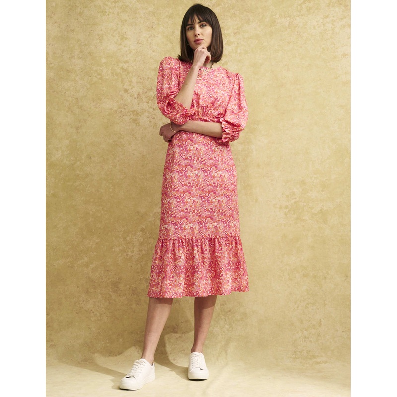 Another Selena day dress for your collection, re-edited in a pink watercolour print. Shes softly shaped with a floaty tiered hem. Her mid-length sleeves have been finished with an elasticated ruffle cuff, cleverly designed so it can be adjusted to just your desired length. Style yours with trainers.