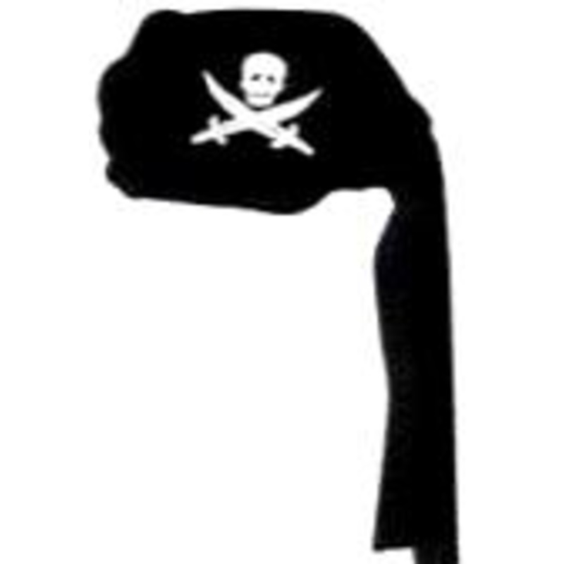 Black cotton pirate bandana Fits on head with elastic back to keep it on. Made for adults but will fit children. Complete with skull and crossbones emblem.