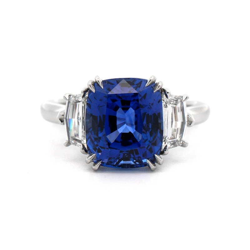 Platinum 3 stone ring featuring a cushion shaped blue sapphire and epaulette diamond sides.