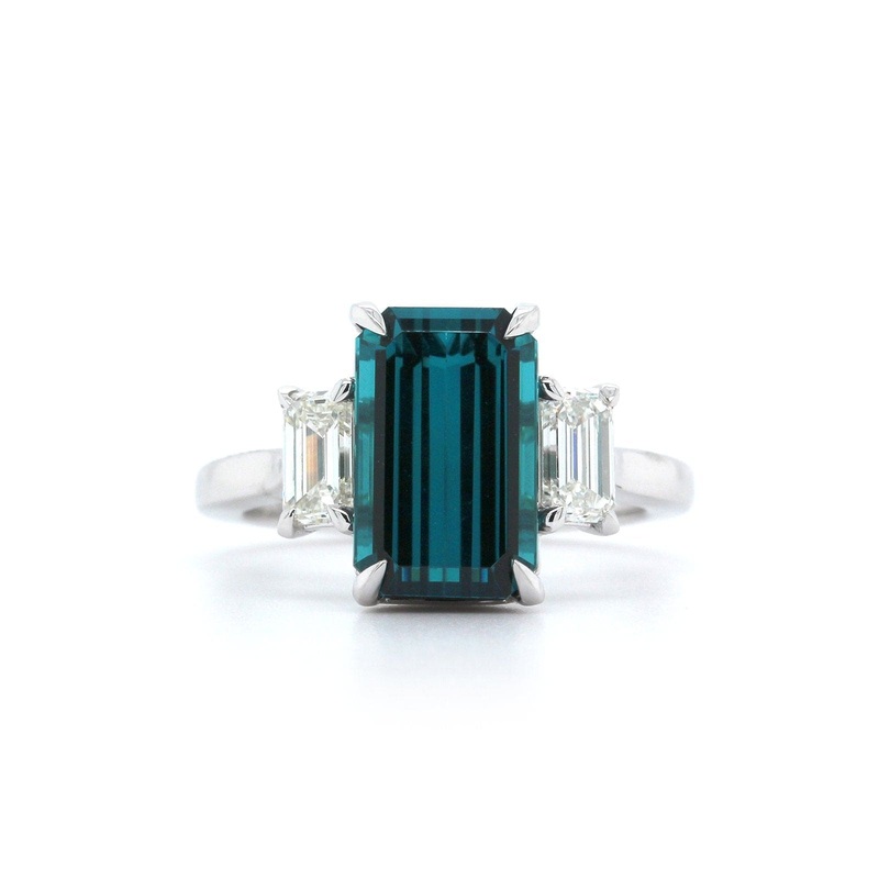 Platinum 3stone tourmaline and diamond ring. The ring is set with a 4.12ct emerald cut indicolite tourmaline and two side emerald cut diamonds with a total weight of .79cts set in a platinum basket three stone setting.