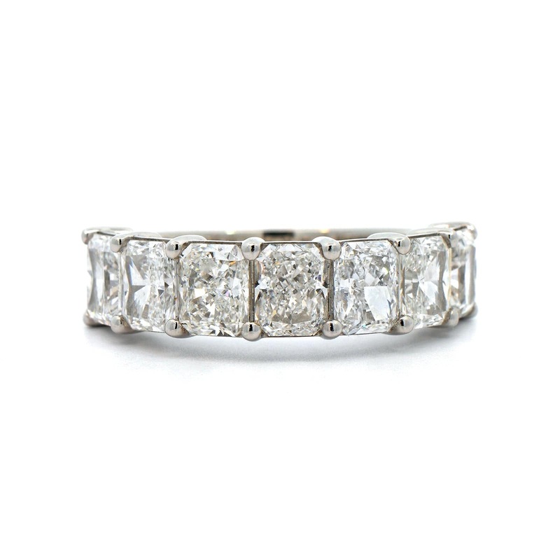 Platinum shared prong band featuring 7 radiant cut diamonds.